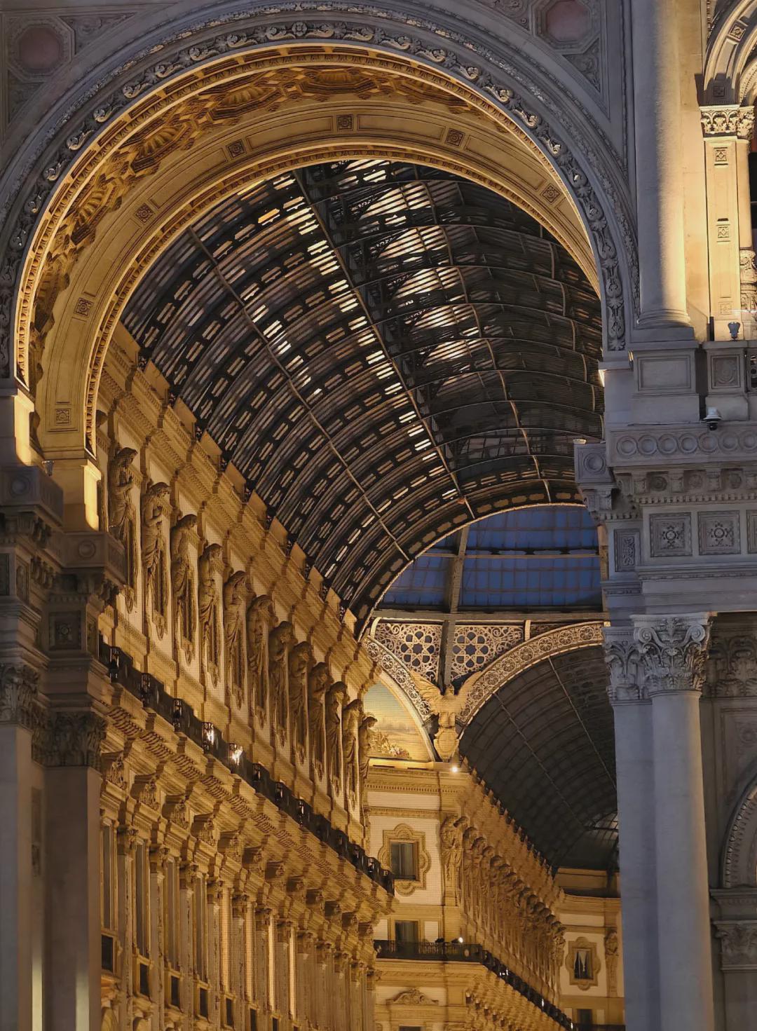 紧邻的维托里奥·埃马努埃莱二世长廊,夜晚更是如梦似幻。金色的光晕洒满地面,整个空间就像一个巨大的、璀璨的“首饰盒”。每一次驻足观赏雕花光影,都像是在拆解一份精美的礼物,充满了惊喜与感动。